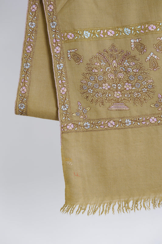 HAND EMBROIDERED CAMEL BROWN MUGHAL BUTI PASHMINA SHAWL