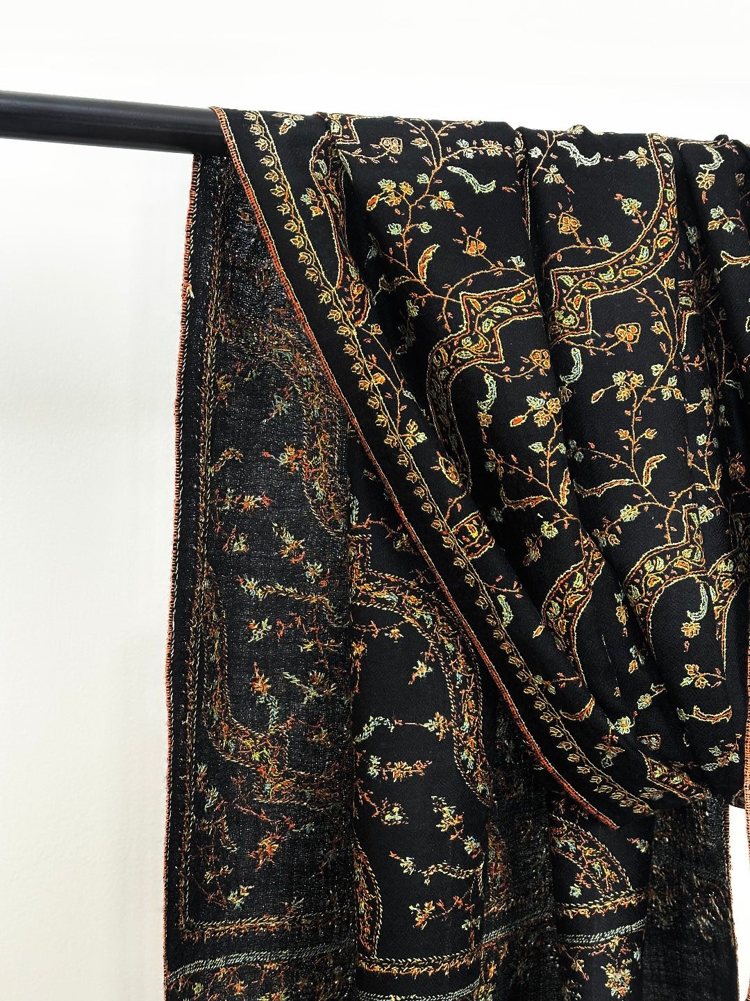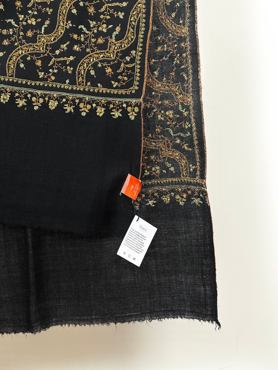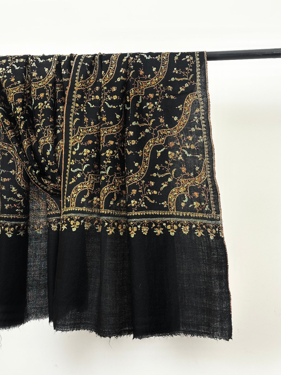 Wearing Black Dahaari Sozni Scarf feels like going back in time and wearing a masterpiece. This exquisite Pashmina Scarf from Kashmir encompasses pure pashmina wool and provides unmatched warmth along with absolute comfort. Features beautiful sozni embroidery which has been preserved in Kashmir for centuries by craftsmen. These soft and decorative patterns help the finer cashmere threads to shine through creating an exquisite piece of art that will be a collectible for generations.
