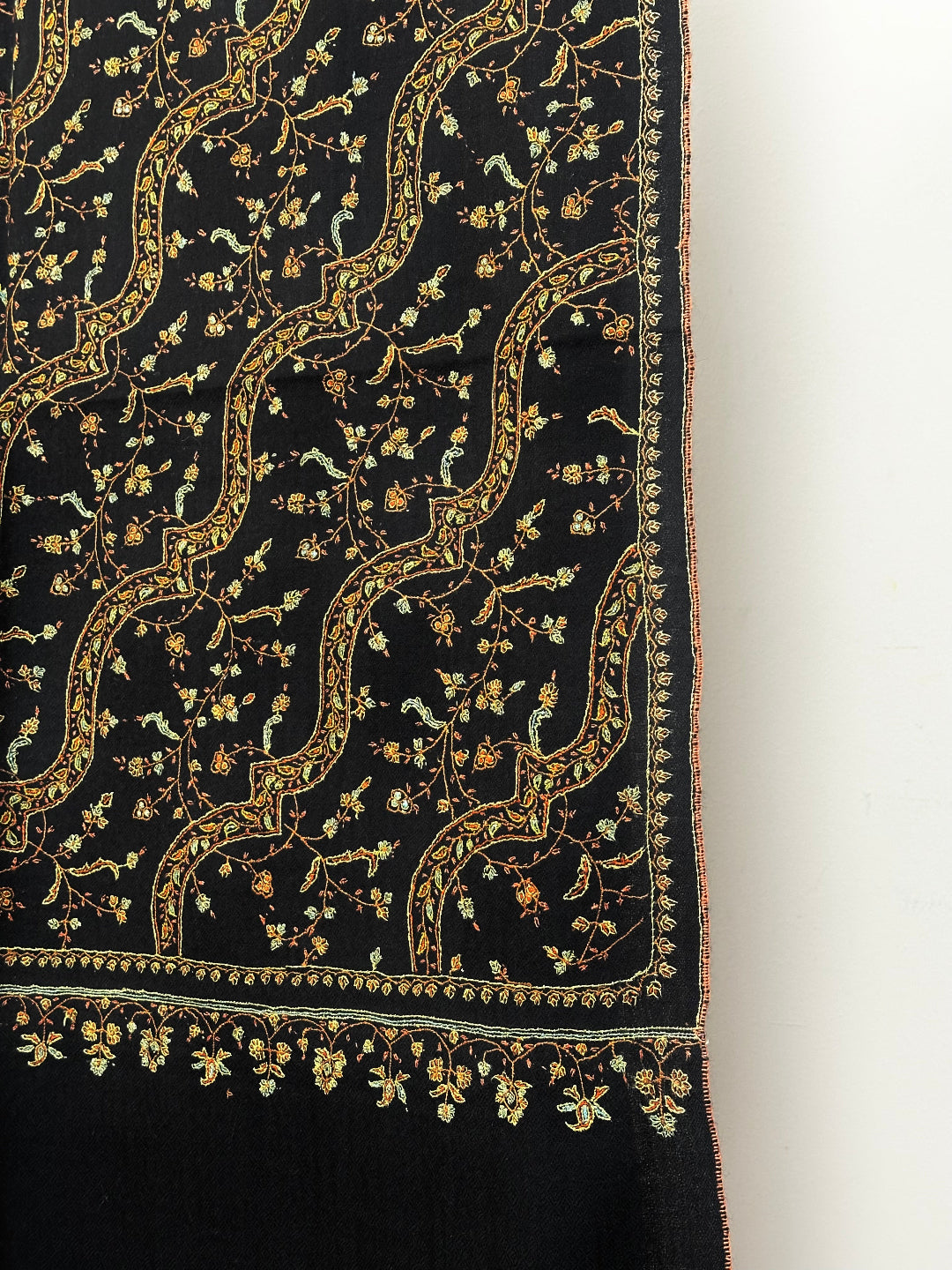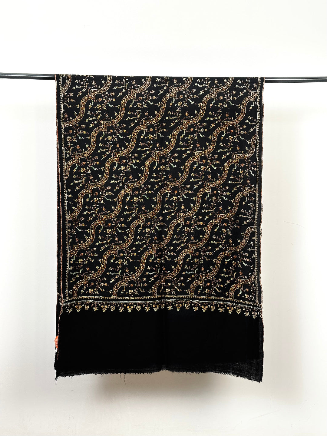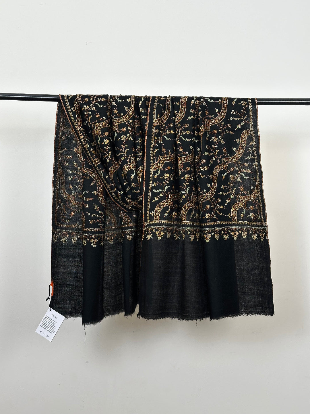 Wearing Black Dahaari Sozni Scarf feels like going back in time and wearing a masterpiece. This exquisite Pashmina Scarf from Kashmir encompasses pure pashmina wool and provides unmatched warmth along with absolute comfort. Features beautiful sozni embroidery which has been preserved in Kashmir for centuries by craftsmen. These soft and decorative patterns help the finer cashmere threads to shine through creating an exquisite piece of art that will be a collectible for generations.