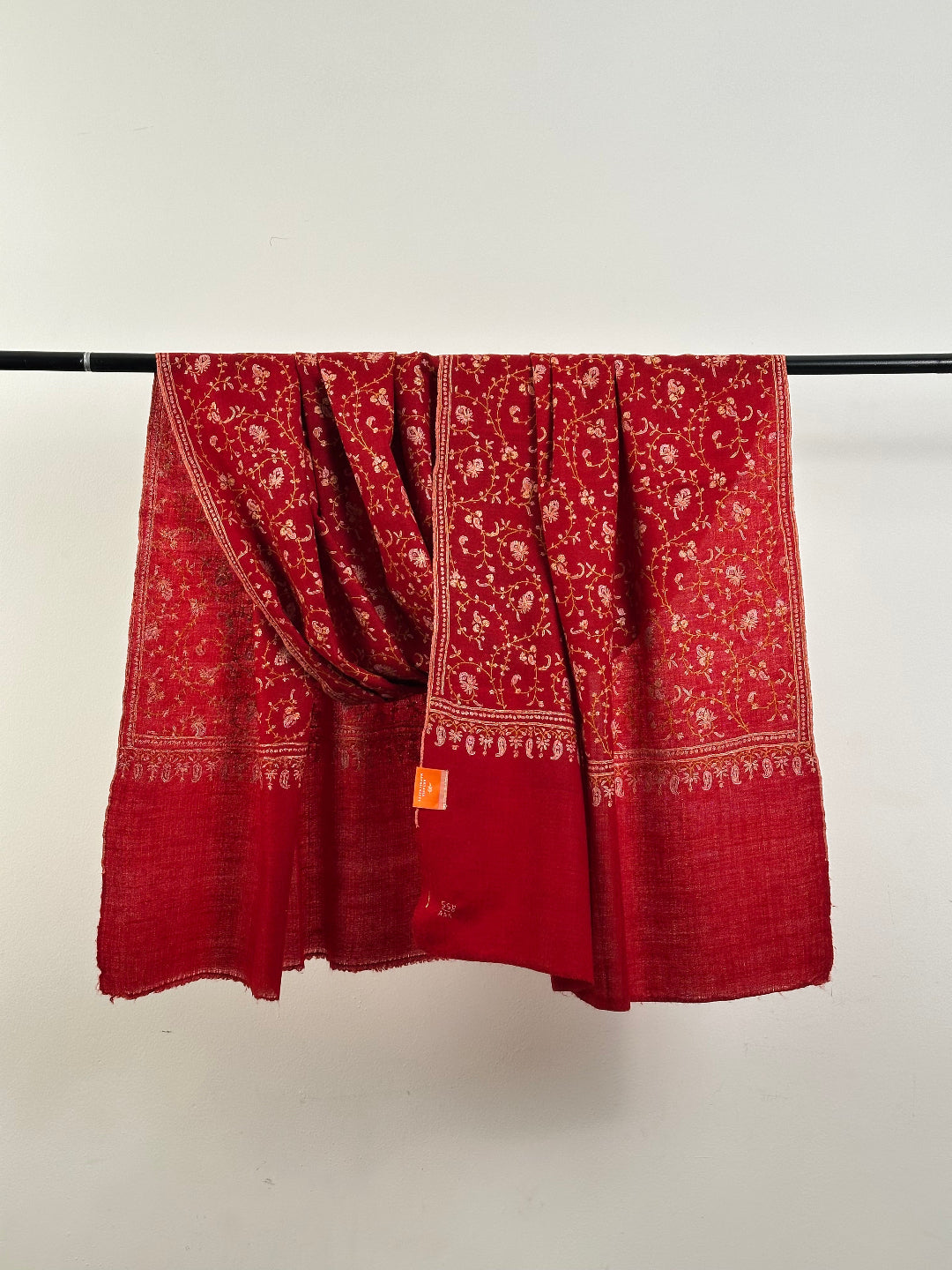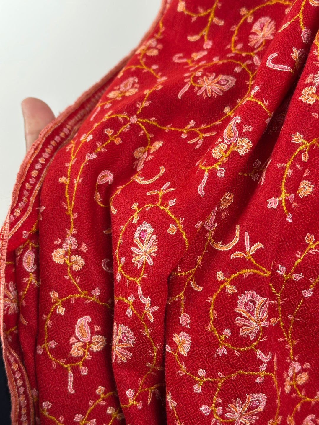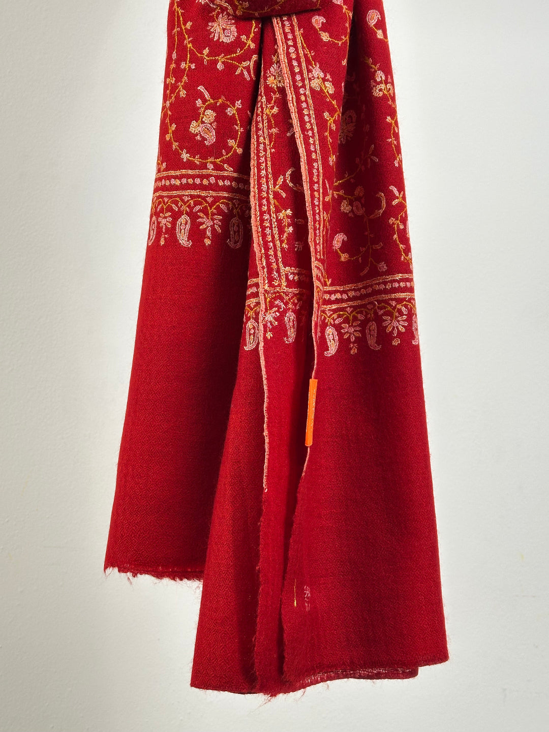 Wearing Indian Red Pashmina Scarf feels like going back in time and wearing a masterpiece. This exquisite Pashmina Sozni Scarf from Kashmir encompasses pure pashmina wool and provides unmatched warmth along with absolute comfort. Features beautiful sozni embroidery which has been preserved in Kashmir for centuries by craftsmen. These soft and decorative patterns help the finer cashmere threads to shine through creating an exquisite piece of art that will be a collectible for generations.