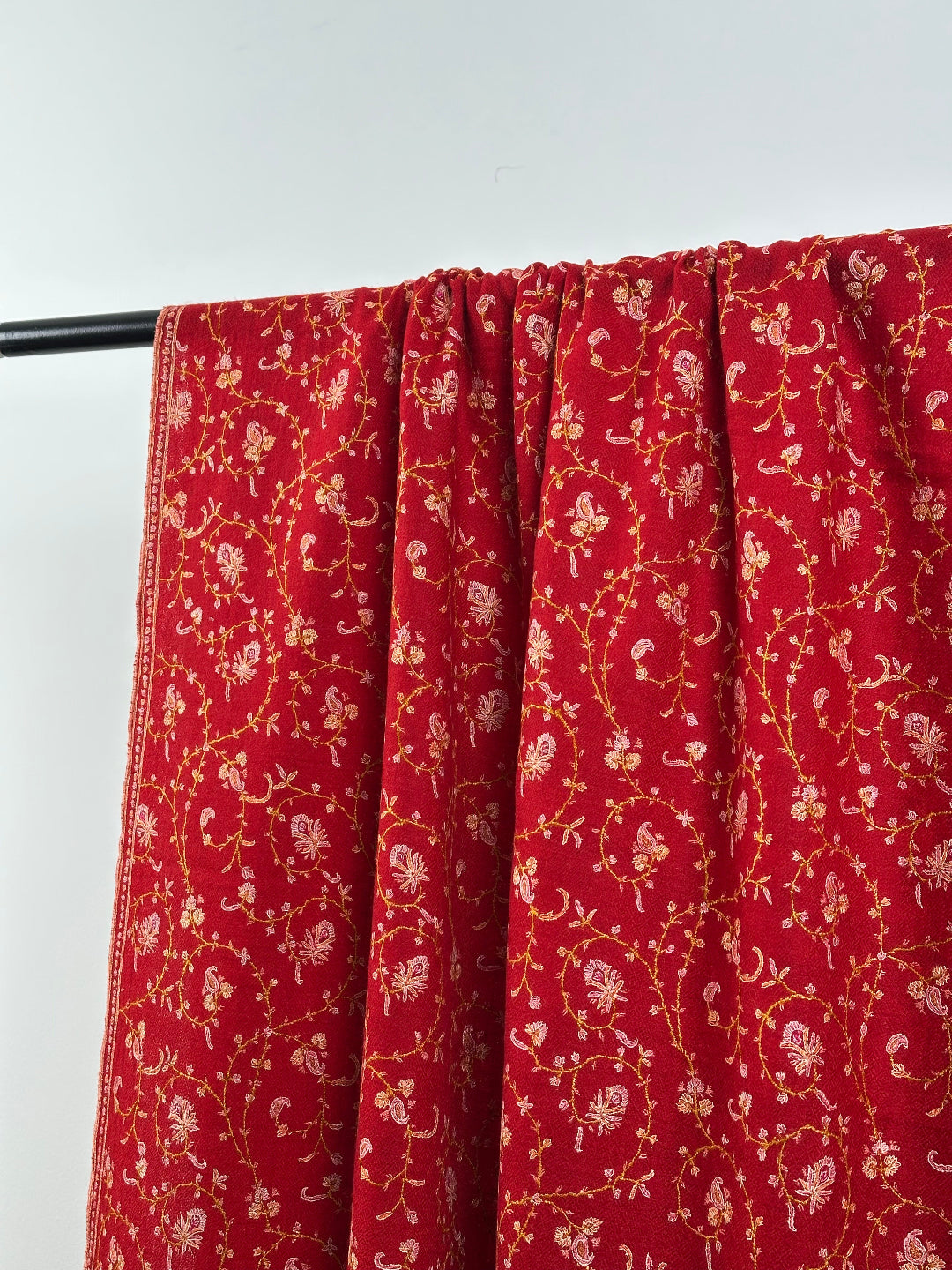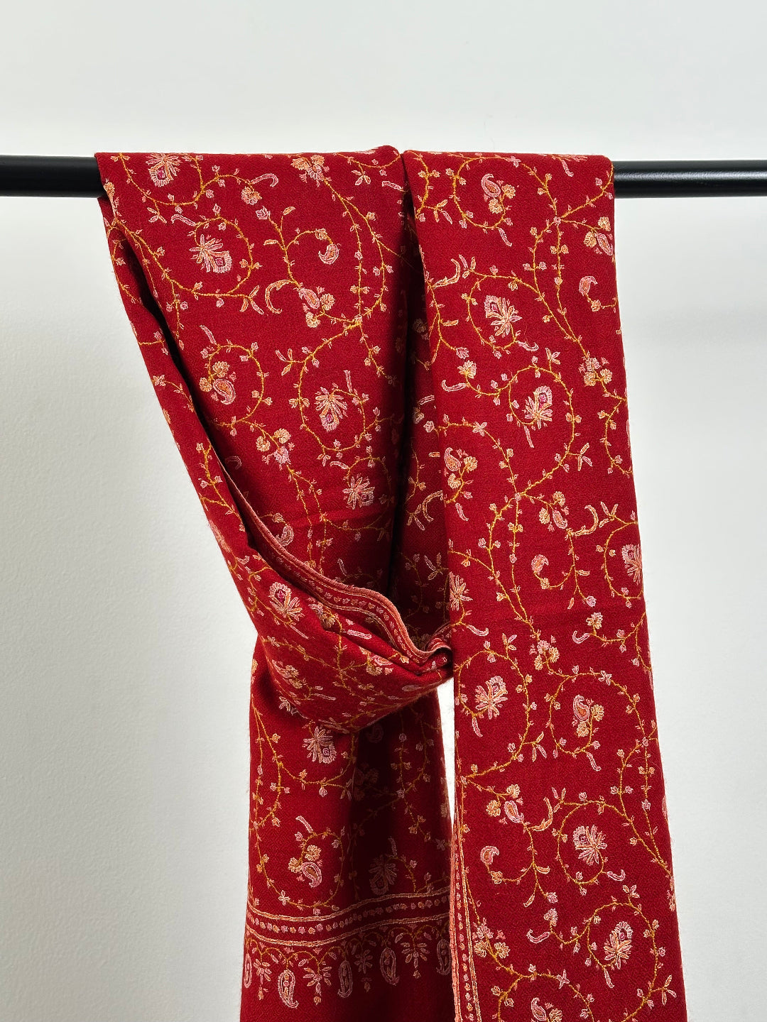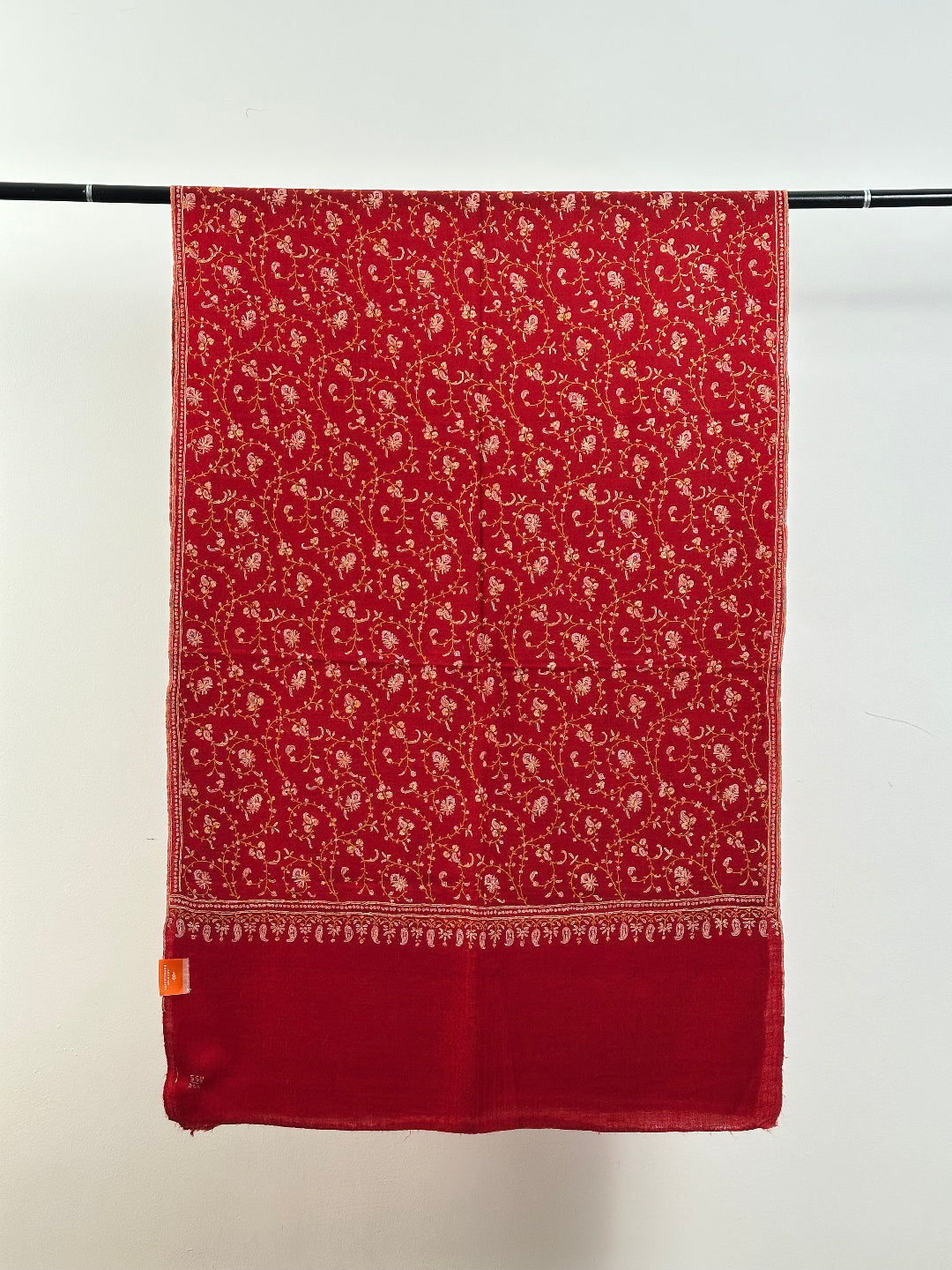 Wearing Indian Red Pashmina Scarf feels like going back in time and wearing a masterpiece. This exquisite Pashmina Sozni Scarf from Kashmir encompasses pure pashmina wool and provides unmatched warmth along with absolute comfort. Features beautiful sozni embroidery which has been preserved in Kashmir for centuries by craftsmen. These soft and decorative patterns help the finer cashmere threads to shine through creating an exquisite piece of art that will be a collectible for generations.