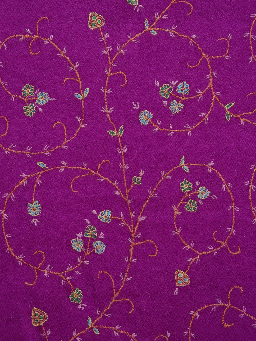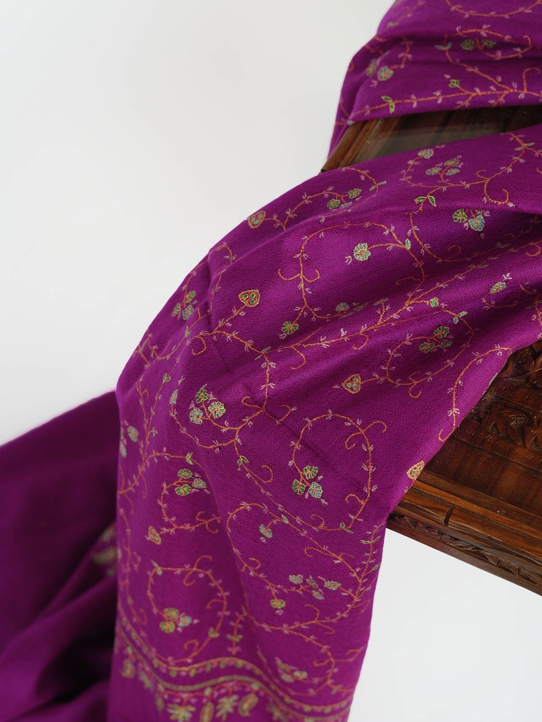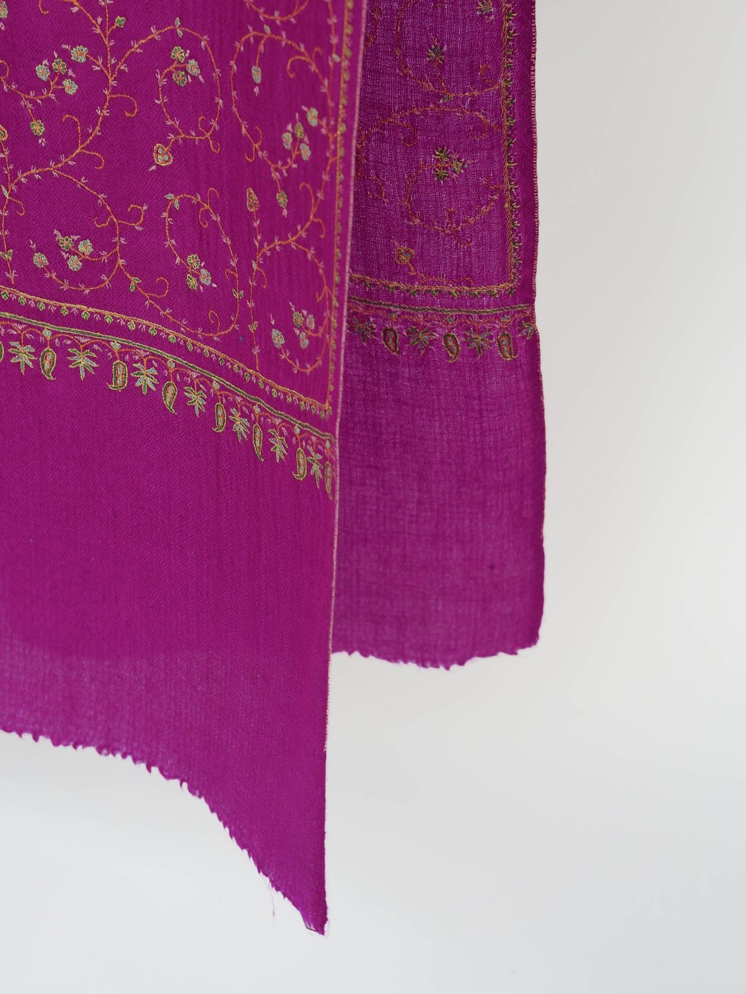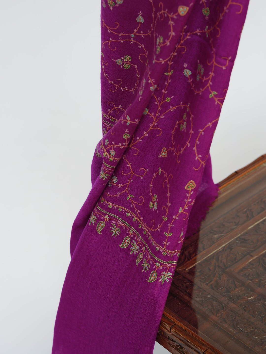 Wearing Purple Jaal Pashmina Scarf feels like going back in time and wearing a masterpiece. This exquisite Pashmina Scarf from Kashmir encompasses pure pashmina wool and provides unmatched warmth along with absolute comfort. Features beautiful sozni embroidery which has been preserved in Kashmir for centuries by craftsmen. These soft and decorative patterns help the finer cashmere threads to shine through creating an exquisite piece of art that will be a collectible for generations.