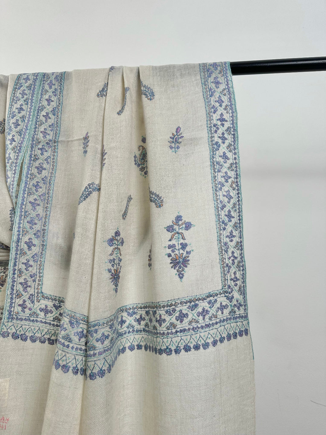 Donning the White Butah Pashmina Scarf allows you to almost travel back in time and wear history and art around your neck. This Kashmiri Pashmina Scarf which is made out of pure pashmina wool wraps you with luxury and warmth like no other. In Kashmir artists worked hard for centuries to develop sozni embroidery , and it bears a striking resemblance to the exquisite needlepoint lace. These soft ornamental patterns assist the finer cashmere threads to fittingly stand out, thus turning them into artistic pieces that will be remembered forever.