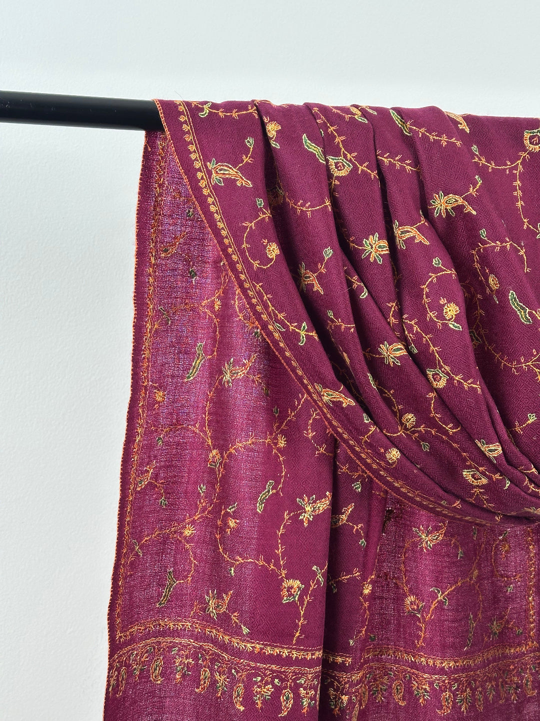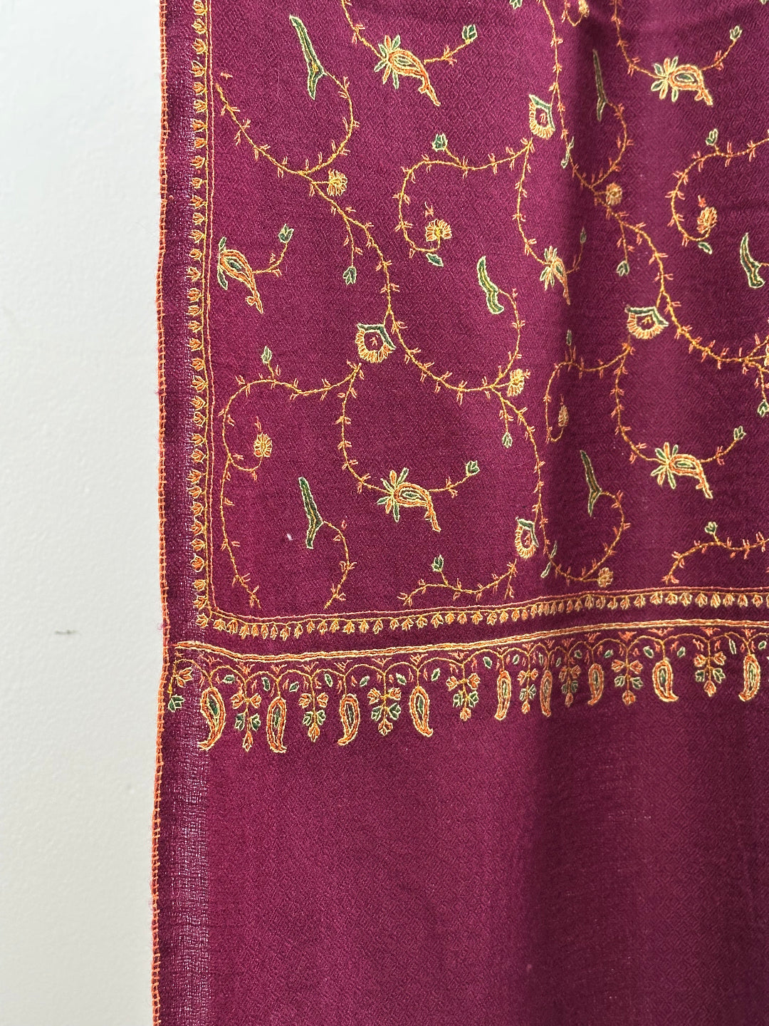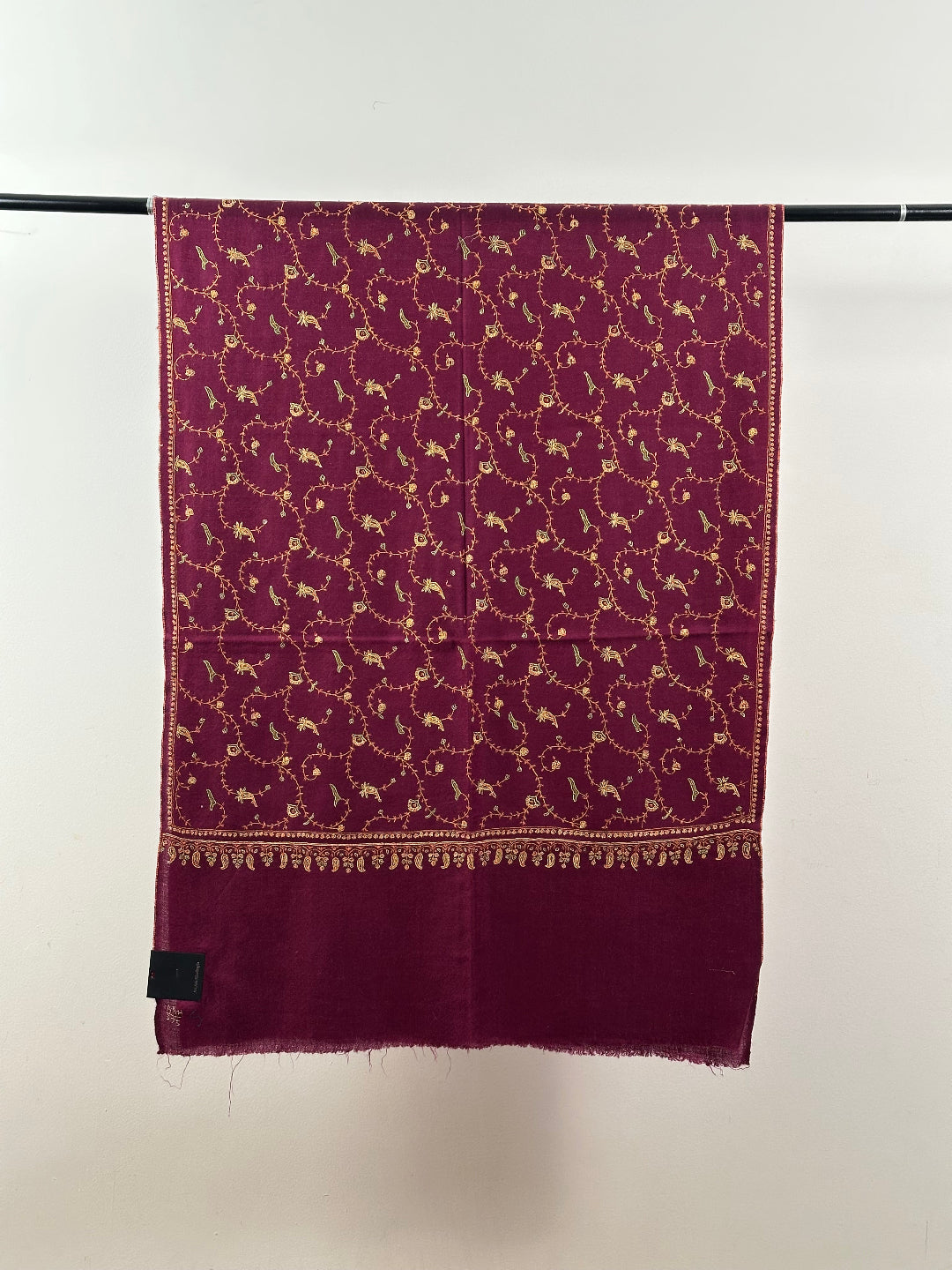 Wearing Wine Pashmina Scarf feels like going back in time and wearing a masterpiece. This exquisite Pashmina Sozni Scarf from Kashmir encompasses pure pashmina wool and provides unmatched warmth along with absolute comfort. Features beautiful sozni embroidery which has been preserved in Kashmir for centuries by craftsmen. These soft and decorative patterns help the finer cashmere threads to shine through creating an exquisite piece of art that will be a collectible for generations.