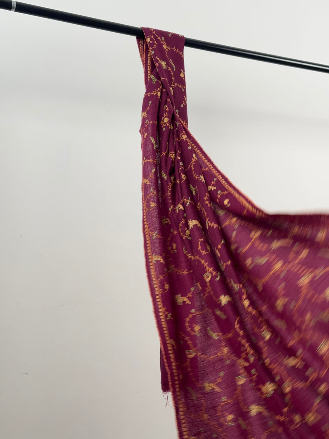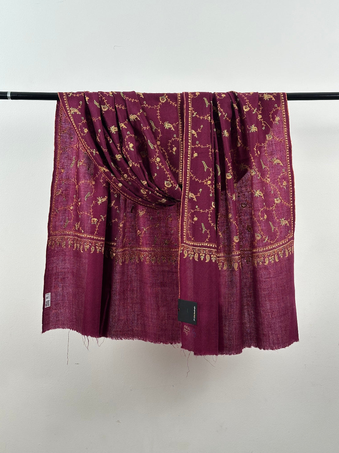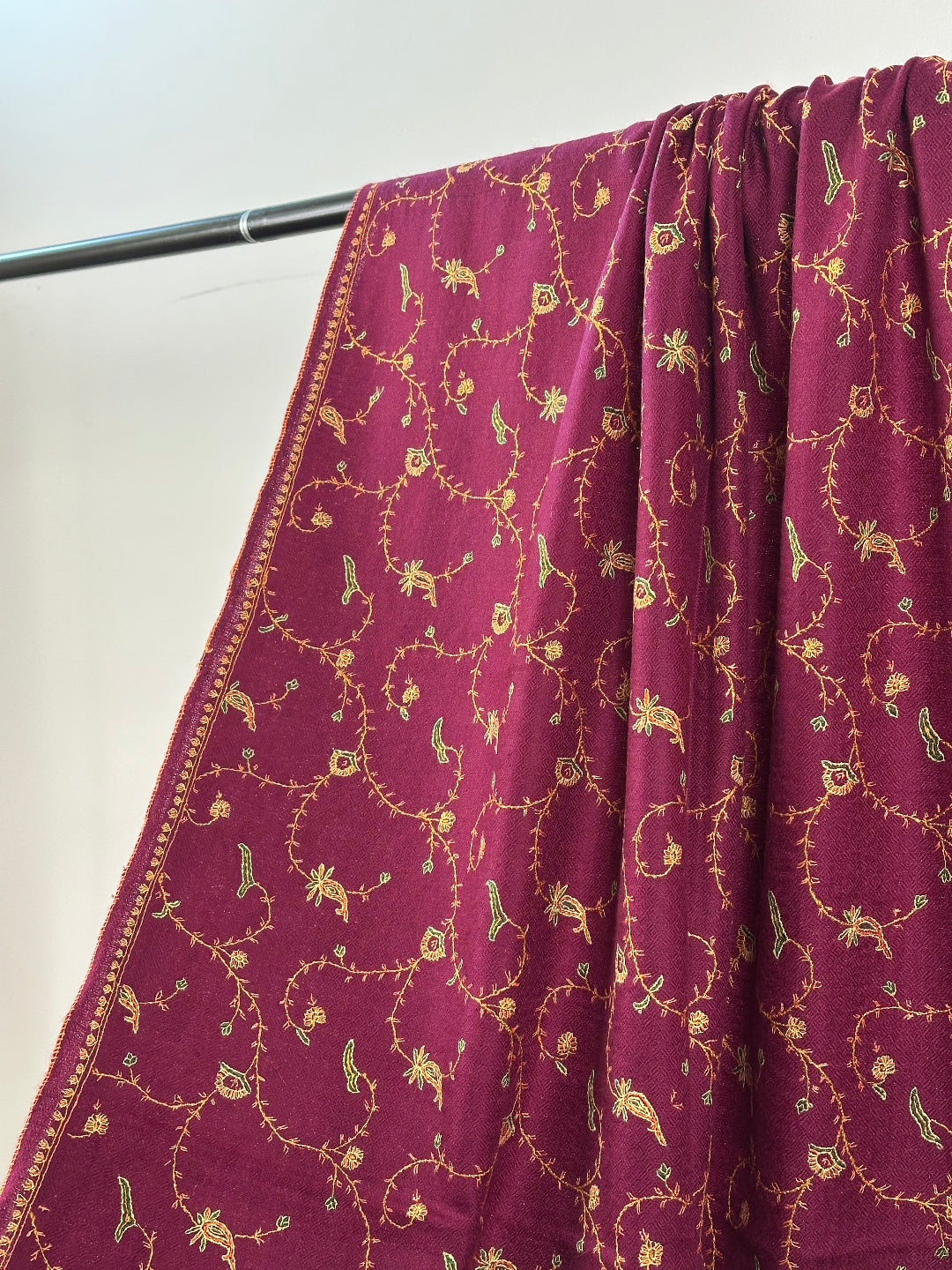 Wearing Wine Pashmina Scarf feels like going back in time and wearing a masterpiece. This exquisite Pashmina Sozni Scarf from Kashmir encompasses pure pashmina wool and provides unmatched warmth along with absolute comfort. Features beautiful sozni embroidery which has been preserved in Kashmir for centuries by craftsmen. These soft and decorative patterns help the finer cashmere threads to shine through creating an exquisite piece of art that will be a collectible for generations.